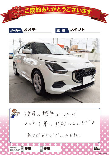 SUZUKI スイフト購入しました。シートの堅さが良いとお勧めにて、とても楽しみです。有難うございました!