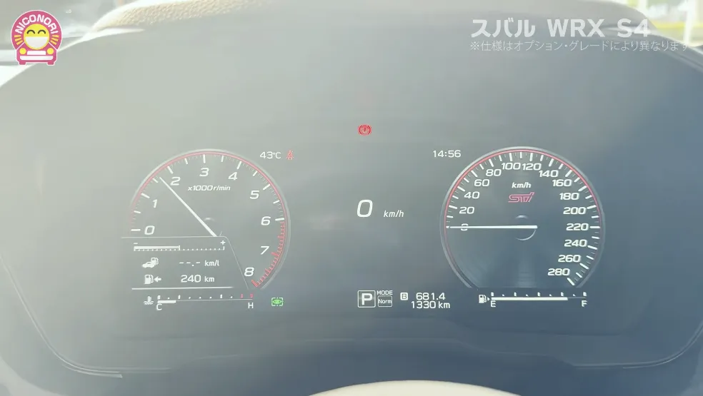 エンジンをかけると、12.3インチのフル液晶メーターが起動します。右の速度メーターには「STI」のポイントがしっかりと入っていますね!刻みが細かく精密な表示となっており、スポーツモデルとしての性能を強調しています。また、メーターが赤枠で囲われているのが、レーシーな緊張感とシャープでモダンな印象を与えていますね。
