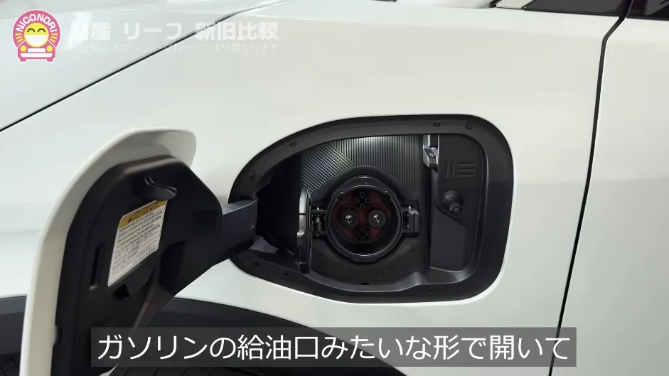 安田さん: 新型は、運転席側のサイドに普通充電口、助手席側のサイドに急速充電口が配置され、ガソリンの給油口と同じようなスタイルで開く仕組みになりました。